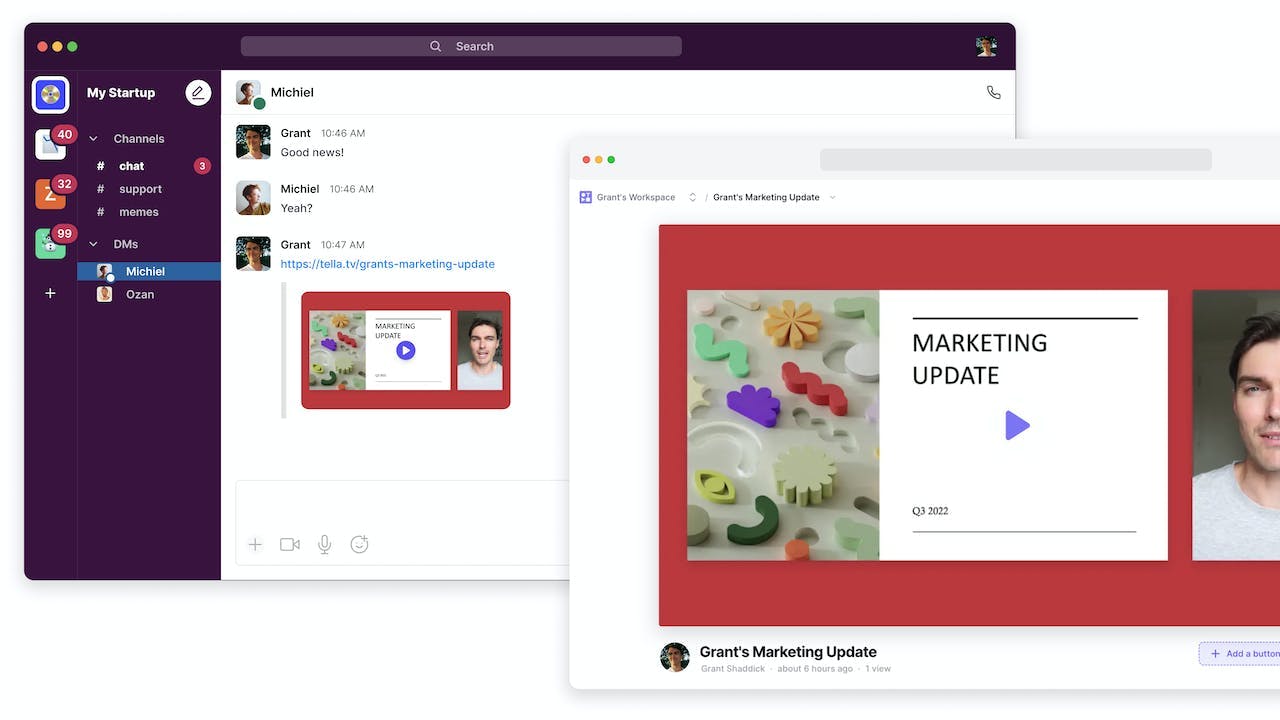 Tella for Slack lets you watch Tella videos without leaving Slack. That means when you share a video with your team in Slack they can watch it without interrupting their workflow. They will receive your message and be able to play the video in the channel instantly. Using Tella and Slack together helps you create better internal communications, faster.